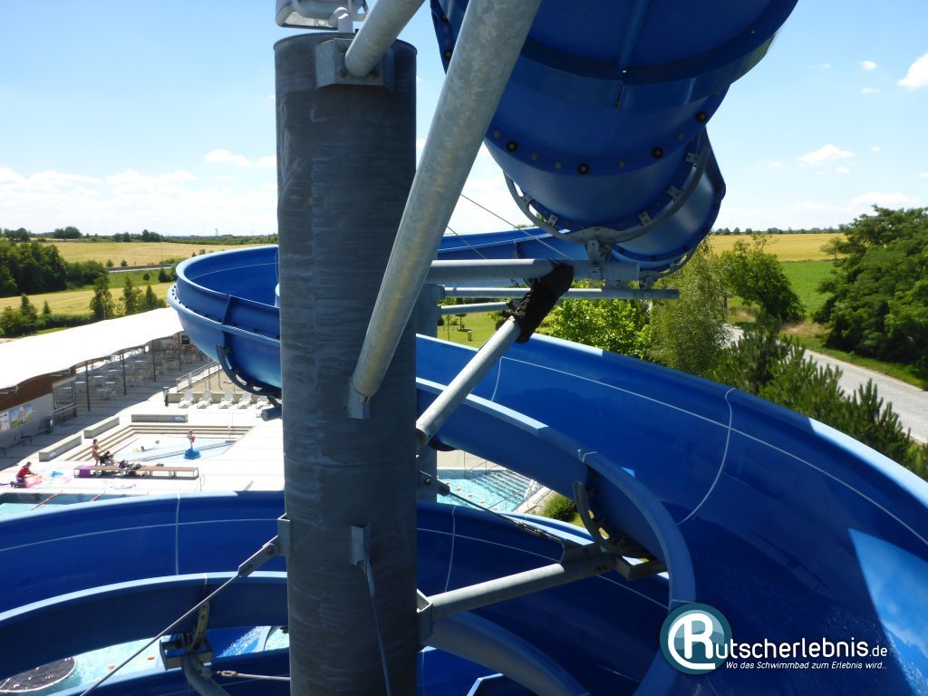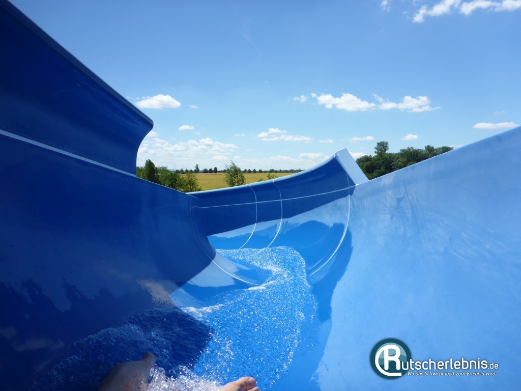 In das Becken münden auch die beiden Riesenrutschen des Freibades im Aquapark Olomouc. Ganz oben aus 12,50 Metern Höhe startet die blaue offene Freibad-Rutsche. Vom Start weg geht es flott durch die Kurven, bei den Richtungswechseln schwingt man schön nach oben. Unten schießt man mit ordentlich Speed per Sofa-Auslauf ins Erlebnisbecken. Dort endet die Rutschpartie nach 117 Metern.